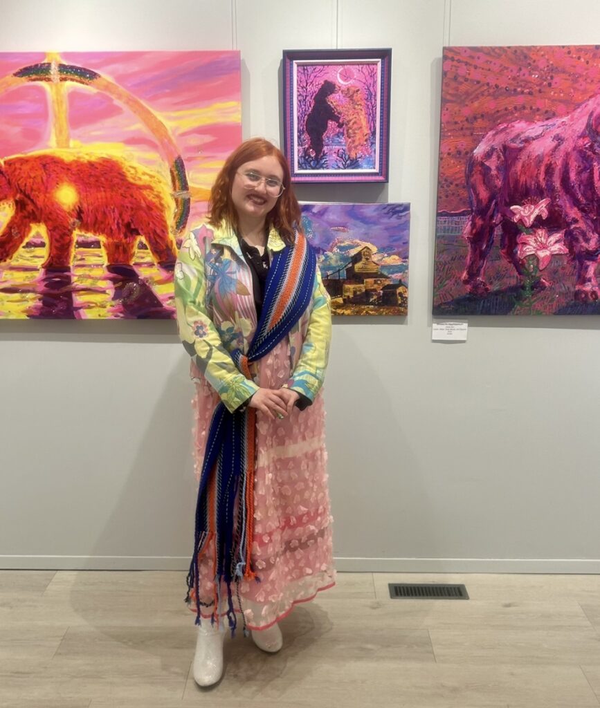 Aleksi Ann is a 27-year-old queer, Métis artist currently based in North Battleford, SK. Her work pulls inspiration from her culturally mixed background, the flora, fauna, backdrop, and history of Saskatchewan, queer culture, and pop culture. She is inspired by impressionism and expressionism, experimental with materials and utilizing bold, imaginative colour to explore emotions, identity, filtering the world through a unique lens. Ann is primarily an acrylic painter, but also enjoys working in other mediums and incorporating mixed media application into her paintings.